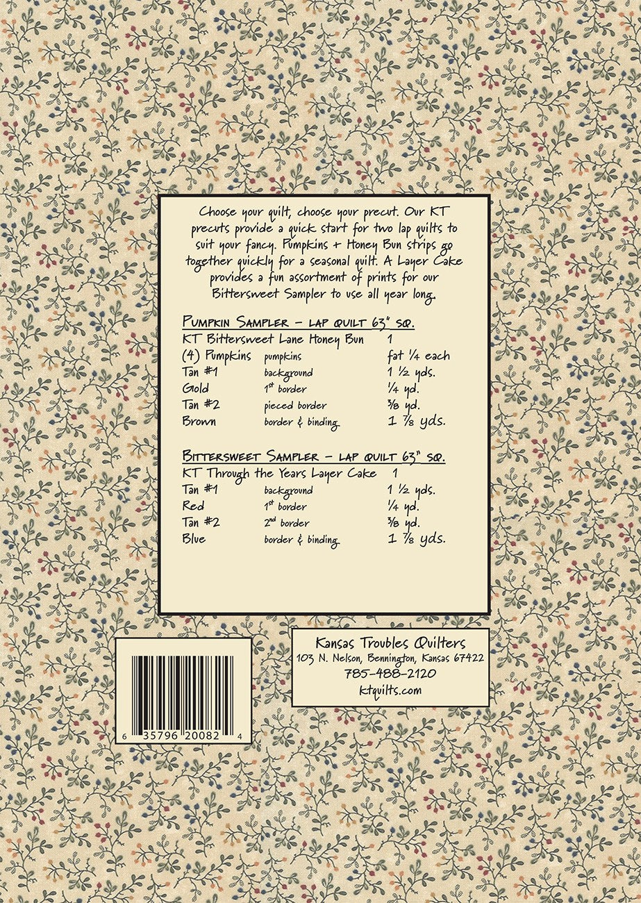 Our KT precuts provide a quick start for two lap quilts to suit your fancy. Pumpkins & Honey Bun strips go together quickly for a seasonal quilt.