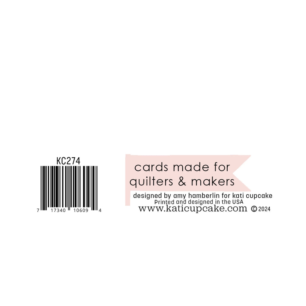 Lighthearted cards for all of your quilty friends. 4-1/4" x 5-1/2", when folded (printed on recycled paper) Blank inside Craft envelope Packaged in a clear Eco bag Original design by Amy Hamberlin Printed and Designed in the USA Copyright Kati Cupcake 2024.