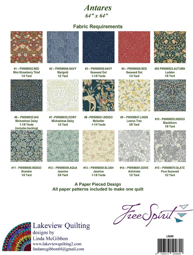 Antares is a 12 month BOM pattern. The feathered double star pieces and the cental star are paper pieced. The rest of the quilt uses traditional piecing methods. The paper foundations pieces are included to make one quilt. No special rulers are needed. It is designed using Free Spirit Fabrics by William Morris and Company.