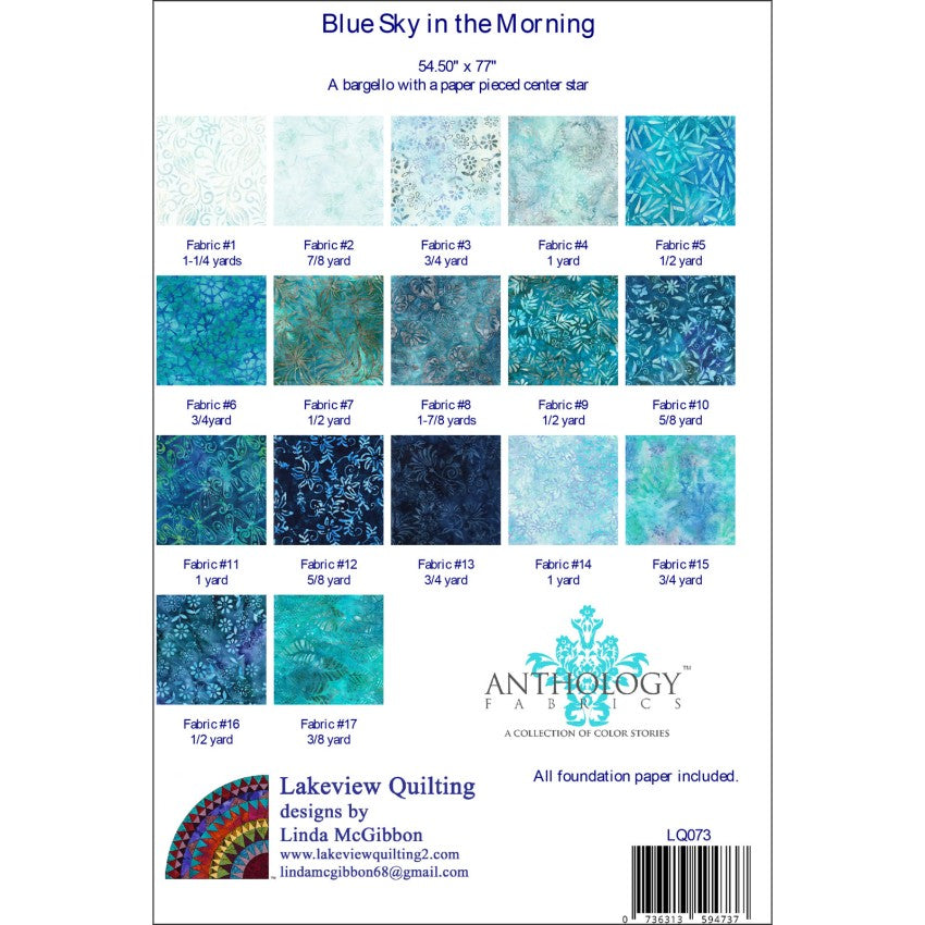Blue Sky in the morning is a combination of a paper pieced Mariner's Compass Block in the center and a modified bargello technique using blocks. All the foundation papers are included. A color chart is provided to help with selecting fabrics. Finished size: 54-1/2" x 77".