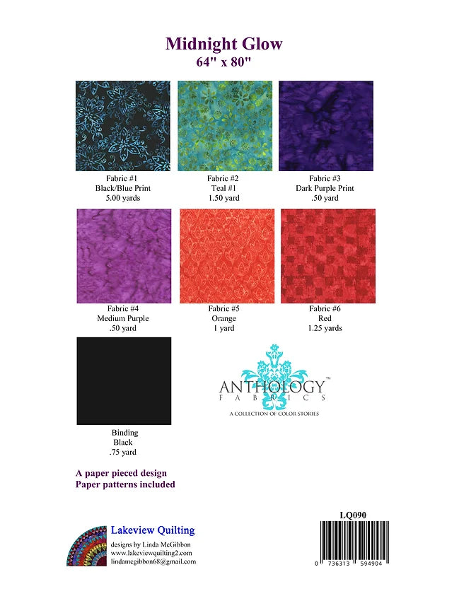 Midnight Glow is designed with Anthology Fabrics. It is a paper pieced pattern which uses two different 7.5"x7.5" blocks. The foundation papers are included to make a 64" x 80" quilt.