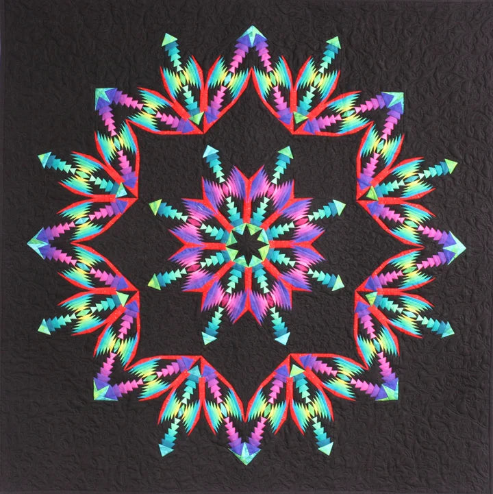 This quilt is a paper pieced design which is consists of 32 pineapple blocks that are in the shape of diamonds. Eight diamonds form the center wheel and the remaining 24 diamonds form the outer wheel. 34" x 34"
