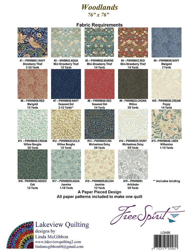 This is a paper pieced design. It is a large Lemoyne Star with feathered diamonds. The border is designed around Morris & Company's strawberry thief fabric. All the foundation papers are included to make the quilt. The quilt measures 76" x 76". It is made with Morris & Company's Reorderable line of fabrics from Free Spirit Fabrics.