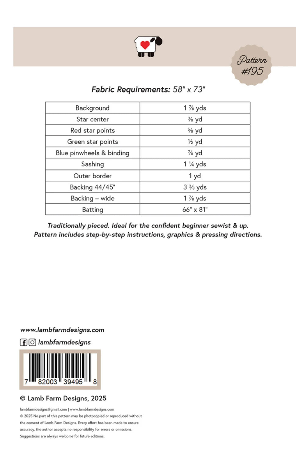 This 58 x 73 Christmas quilt is a confident beginner-friendly design that combines the timeless beauty of traditional star blocks with the festive charm of red, blue, and green fabrics.