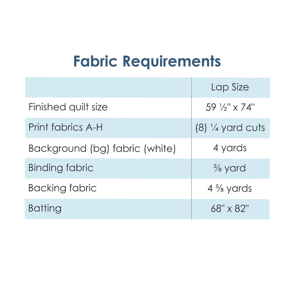 The full color quilt pattern also contains a coloring page to test out color schemes and quilting designs. See the pictures for the fabric requirements and renderings of different colorways.