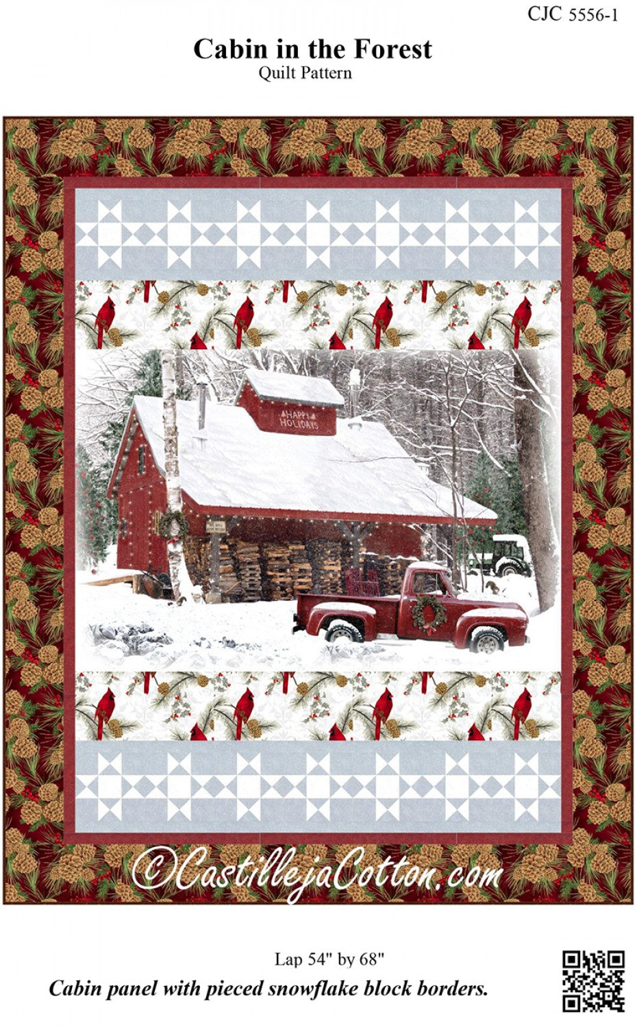 Cabin panel with pieced snowflake block borders. Cabin with red truck panel quilt pattern.
