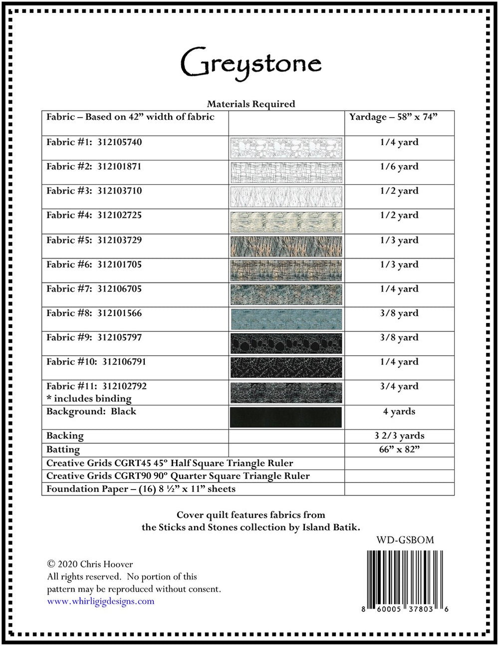 This beautiful 58in x 74in quilt is the perfect BOM project! Pattern is written as a 6 or 7 month BOM but can also be used as a stand alone pattern. Featuring Island Batik fabrics from the Sticks and Stones collection, this will be a favorite.