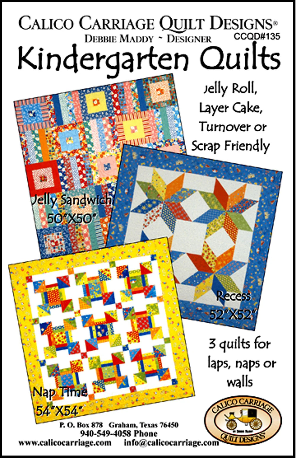 Kindergarten Quilts is three different lap quilts in one pattern. Jelly Sandwich uses one Jelly Roll. Nap Time uses one Layer Cake. Recess uses one Turnover. Quilts for laps, naps or walls.