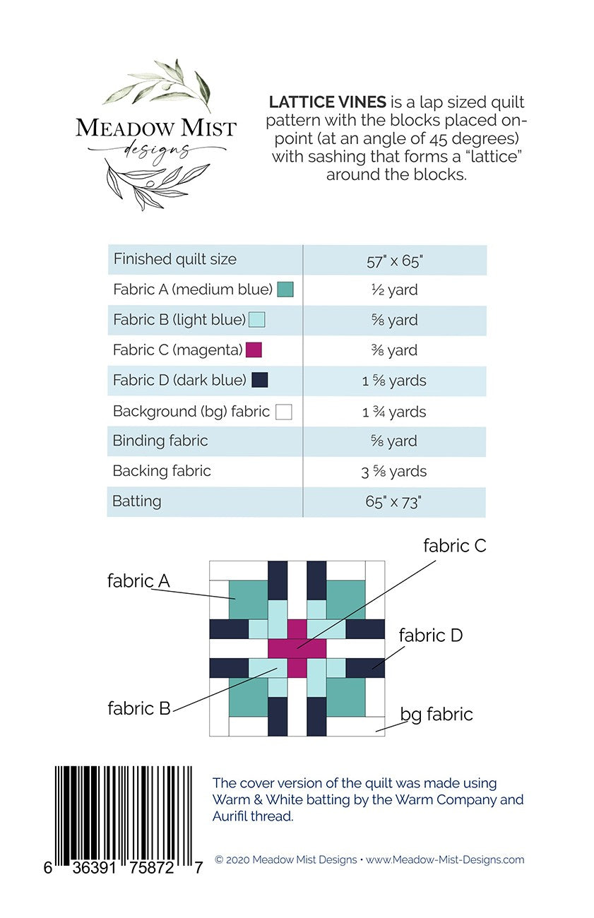 Lattice Vines is an intermediate level quilt pattern where the blocks are set on point and the sashing becomes the lattice. The lap sized quilt pattern contains a coloring sheet to audition possible color schemes and fabrics.