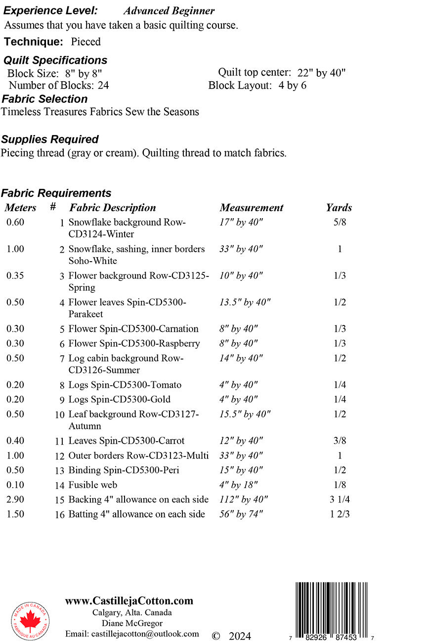Pattern features four different pieced seasonal blocks - snowflakes, leaves, and two flower blocks.