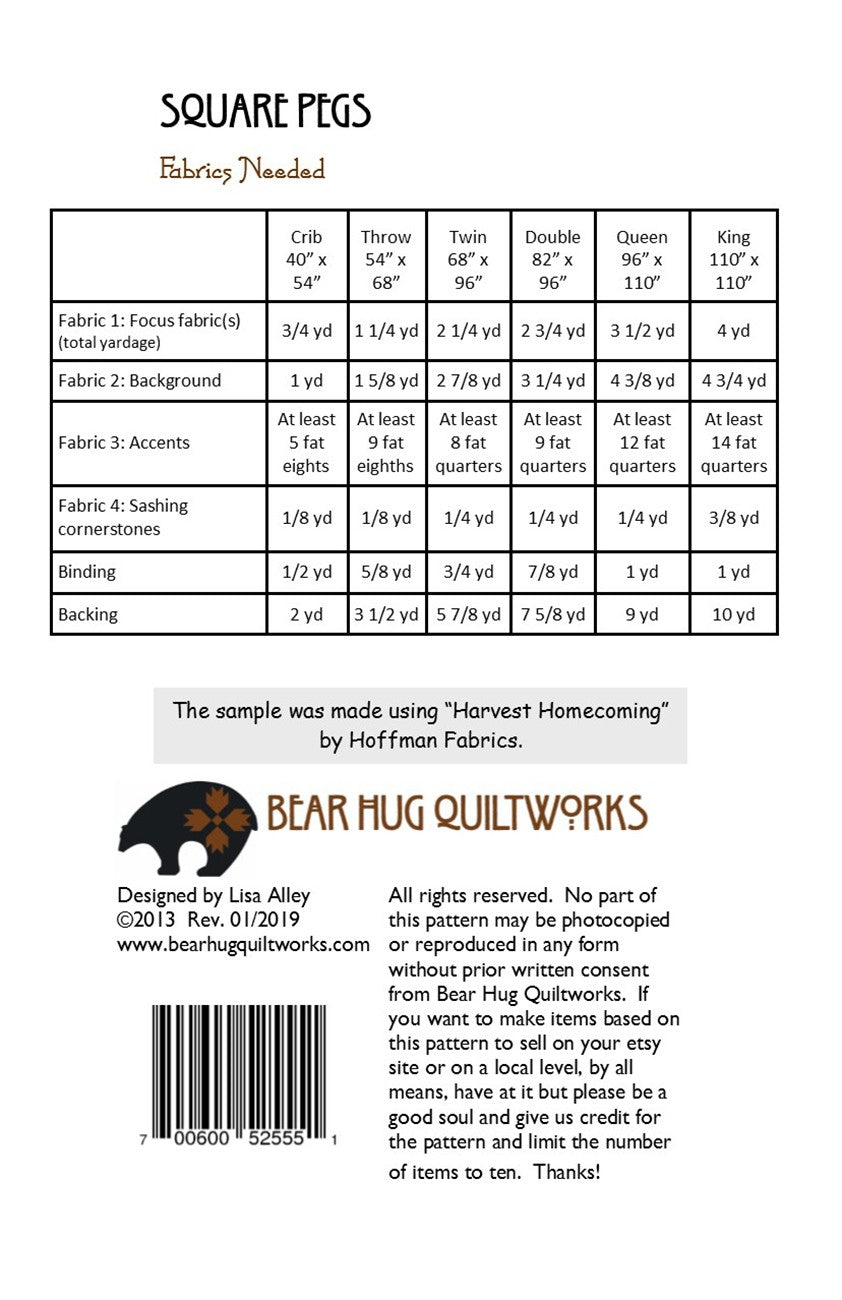 Square Pegs Quilt Pattern is backordered and will ship as soon as it is back in stock.