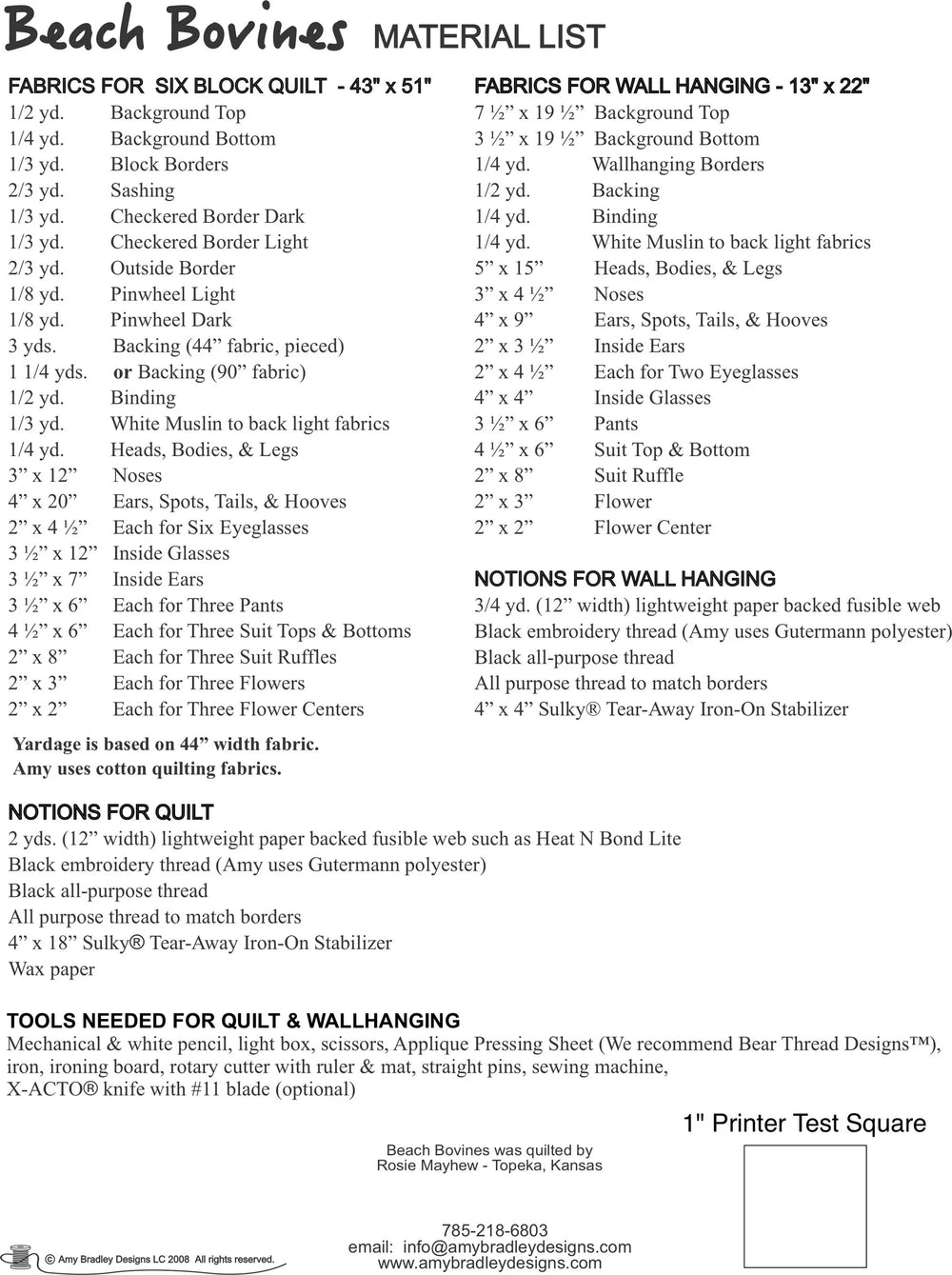 Beach Bovines download pattern includes instructions, full size patterns, and placement sheets to make both a 43" x 51" six block quilt and a  13" x 22" two cow wallhanging.