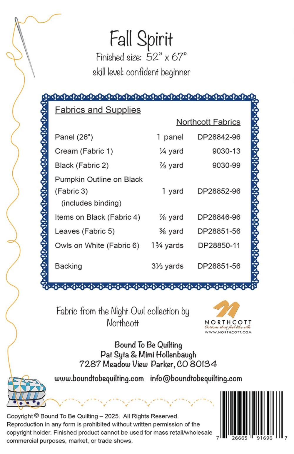 Autumnal leaves and cream colored star blocks accent this Night Owl panel (26) from Northcott. Owls and leaves fabrics provide additional emphasis to the Fall theme. Finished size is 52 x 67, and skill level is confident beginner.