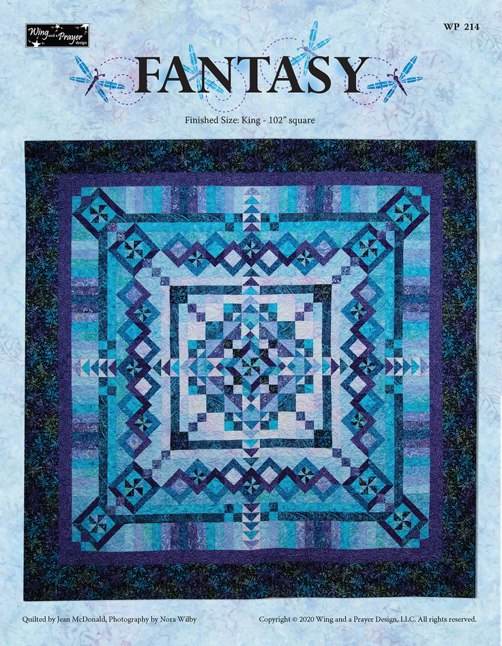 Dragonflies burst from the center amid whimsical color combinations and the double woven pinwheel border in this traditionally pieced 102in square quilt. Tonga Fantasy is a 14-piece Batik collection that was inspired and developed around the dragonfly focal piece (Tonga-B7904 Fantasy). The colors in this collection range from the lightest of blues to hints of turquoise to deep purple.