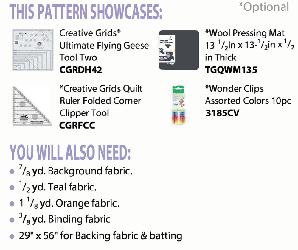 The Creative Grids® Ultimate Flying Geese Tool Two contains all the markings you’ll need to make and trim 8 different flying geese ranging from 3/4in x 1-1/2in to 4-1/4in x 8-1/2in.