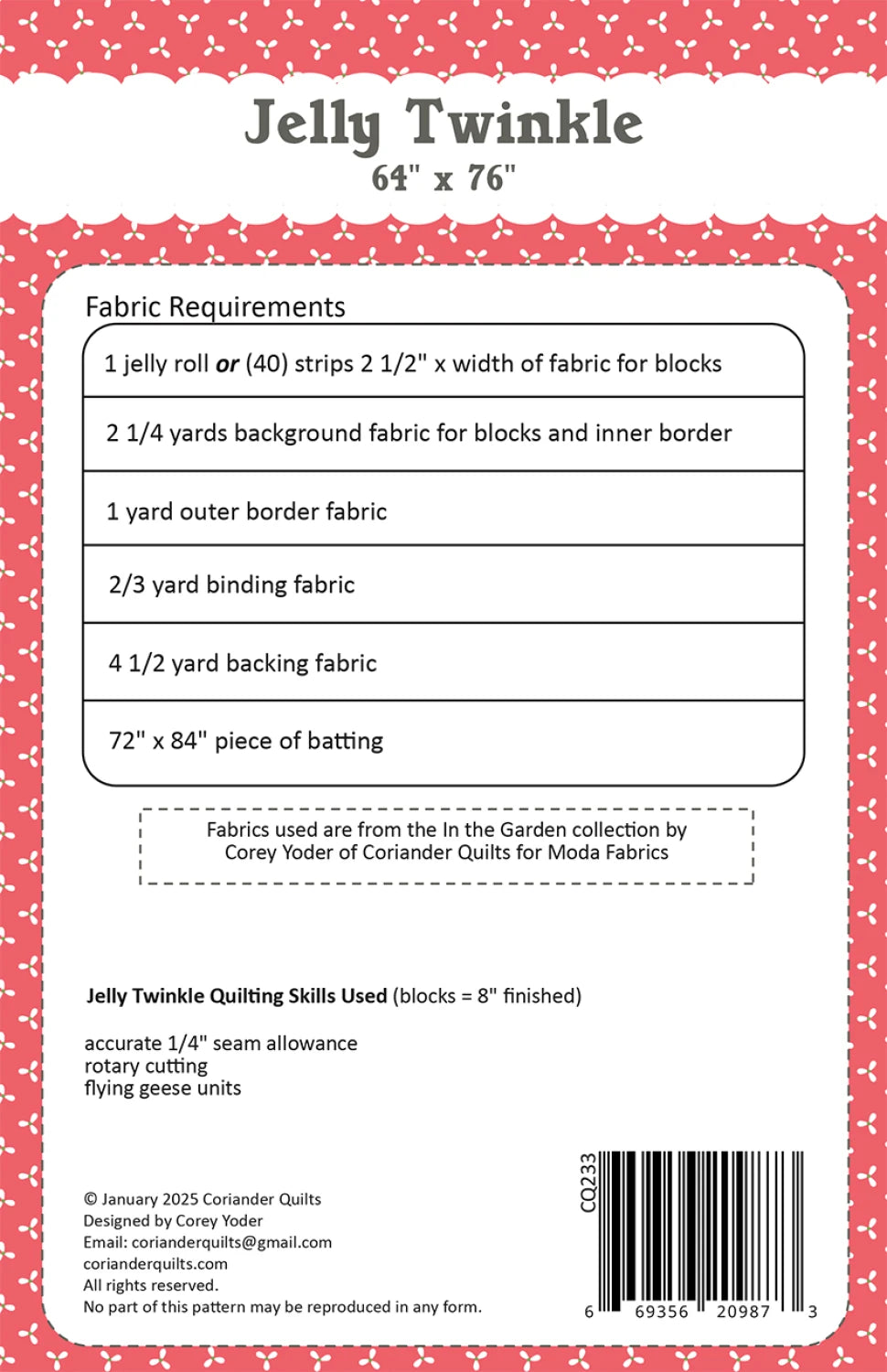 The Jelly Twinkle Quilt pattern designed by Corey Yoder of Coriander quilts is a full color booklet type pattern with detailed illustrations and instructions.