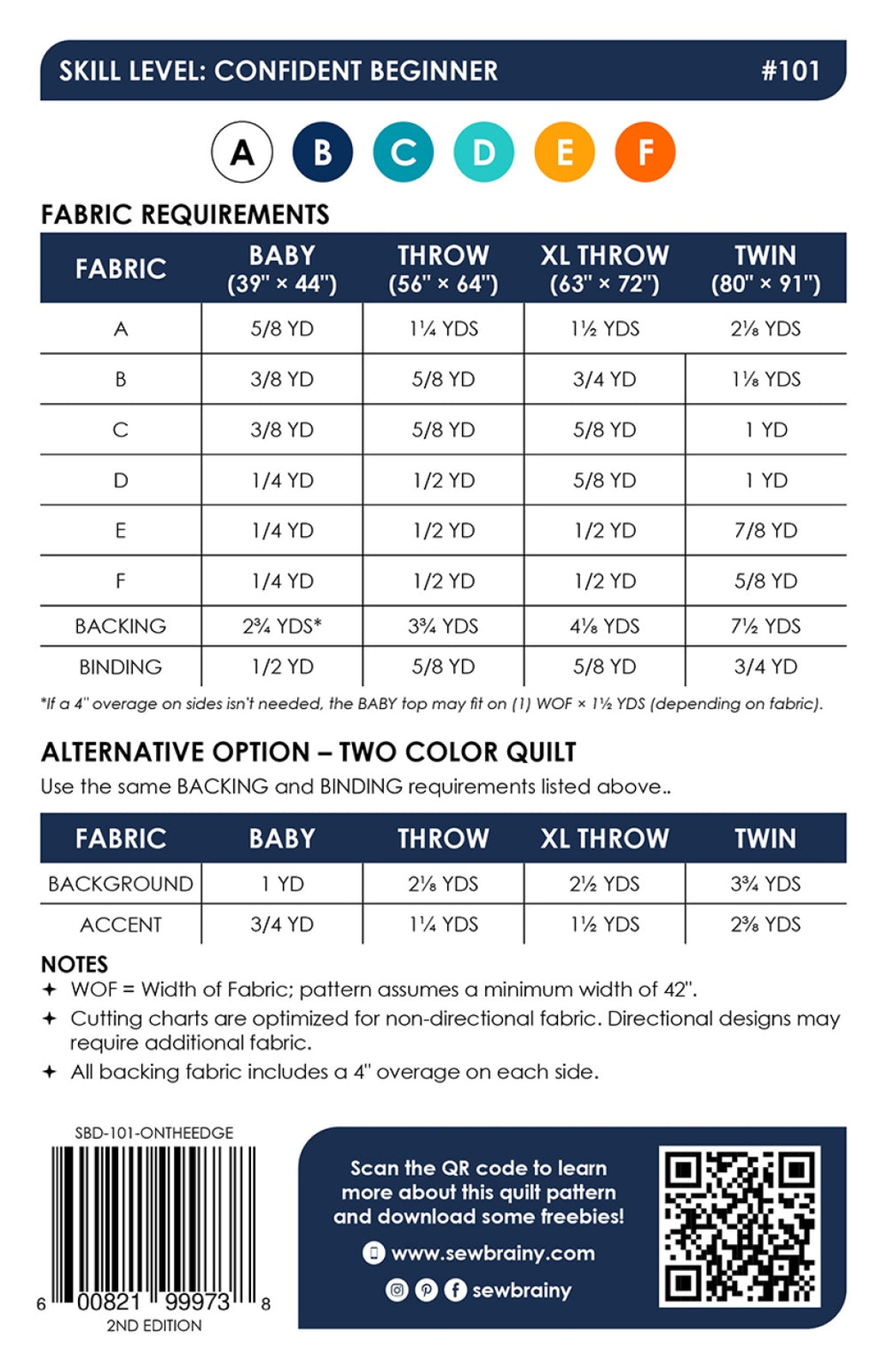 The On the Edge quilt pattern by Jamie Siel of Sew Brainy Designs is a traditionally pieced modern quilt pattern that is perfect for the confident beginner. It is a scaled design (all sizes have the same layout) that comes in 4 sizes: Baby (39 x 44), Throw (56 x 64), XL Throw (63 x 72), and Twin (80 x 91). This printed pattern is formatted as a saddle stitch booklet (5.5 x 8.5) with full color illustrations for each step.