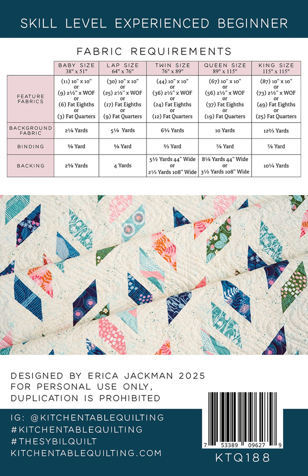 The Sybil Quilt Pattern is a fun, bold design that transforms simple shapes into a quilt with gorgeous visual movement. Whether you’re working from your scrap bin, stash, fat quarters, jelly roll strips, fat eighths, or layer cake squares, this pattern is a flexible favorite that plays beautifully with contrast and color. This full pattern includes: Easy-to-follow instructions for 5 sizes: baby, lap, twin, queen, and king. Fabric requirements and cutting charts for each size Clear diagrams for block and quilt top assembly Tips for fabric selection Precut-friendly instructions (fat eighths, fat quarters, jelly roll, or layer cake). Quilt Sizes Baby Size – 38 x 51 Lap Size – 64” x 76” Twin Size – 76” x 89” Queen Size – 89” x 115” King Size – 115” x 115”
