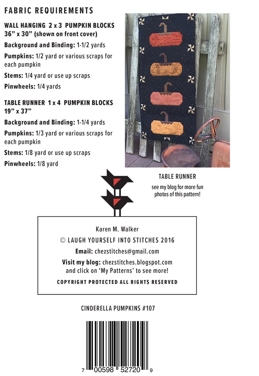 Pattern variations offer Wall hanging 2 x 3 Pumpkin Blocks  36” x 30” (shown on front cover) or Table Runner 1 x 4 Pumpkin Blocks  19” x 37 (shown on back cover).  All piecing uses traditional rotary cutting methods.