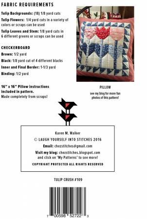 Two different projects are included in this great tulip pattern! Large tulips surrounded by a checkerboard make up the 54” x 72” quilt while small tulips (half the size of the larger ones) make a cheerful Spring pillow (16” x 16”) shown on the back cover.