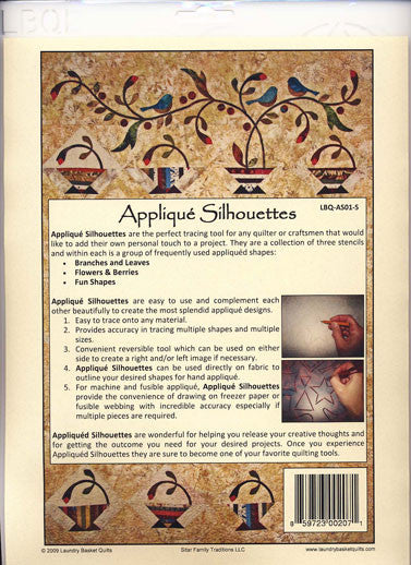 Applique Silhouettes Stencil Set - Add your own personal touch to a project. A collection of three stencils and within each is a group of frequently used applique shapes: Branches & Leaves, Flowers & Berries, & Fun Shapes. (1) Easy to trace onto any material. (2) Provides accuracy in tracing multiple shapes & sizes. (3) Reversible tool which can be used on either side to create a right and (or) left image if necessary. (4) Use directly on fabric to create desired shapes for hand applique. (5) For machine & fusible applique: draw on freezer paper or fusible webbing with accuracy.