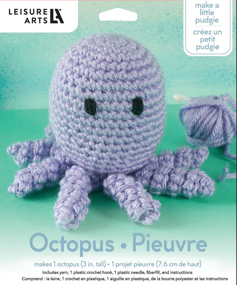 Leisure Arts Crochet Kit Amigurumi Pudgies Octopus- Crochet an adorable, 3" tall, round octopus. Kit Includes: yarn, 1 plastic crochet hook, 1 plastic needle, fiberfill and step-by-step instructions. Easy skill level. Colors and contents may vary.