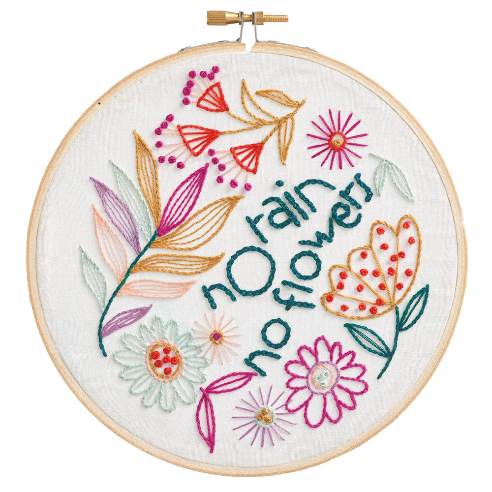 Leisure Arts Embroidery Kit 6 No Rain No Flowers- Printed embroidery design features an array of flowers with the words no rain no flowers.