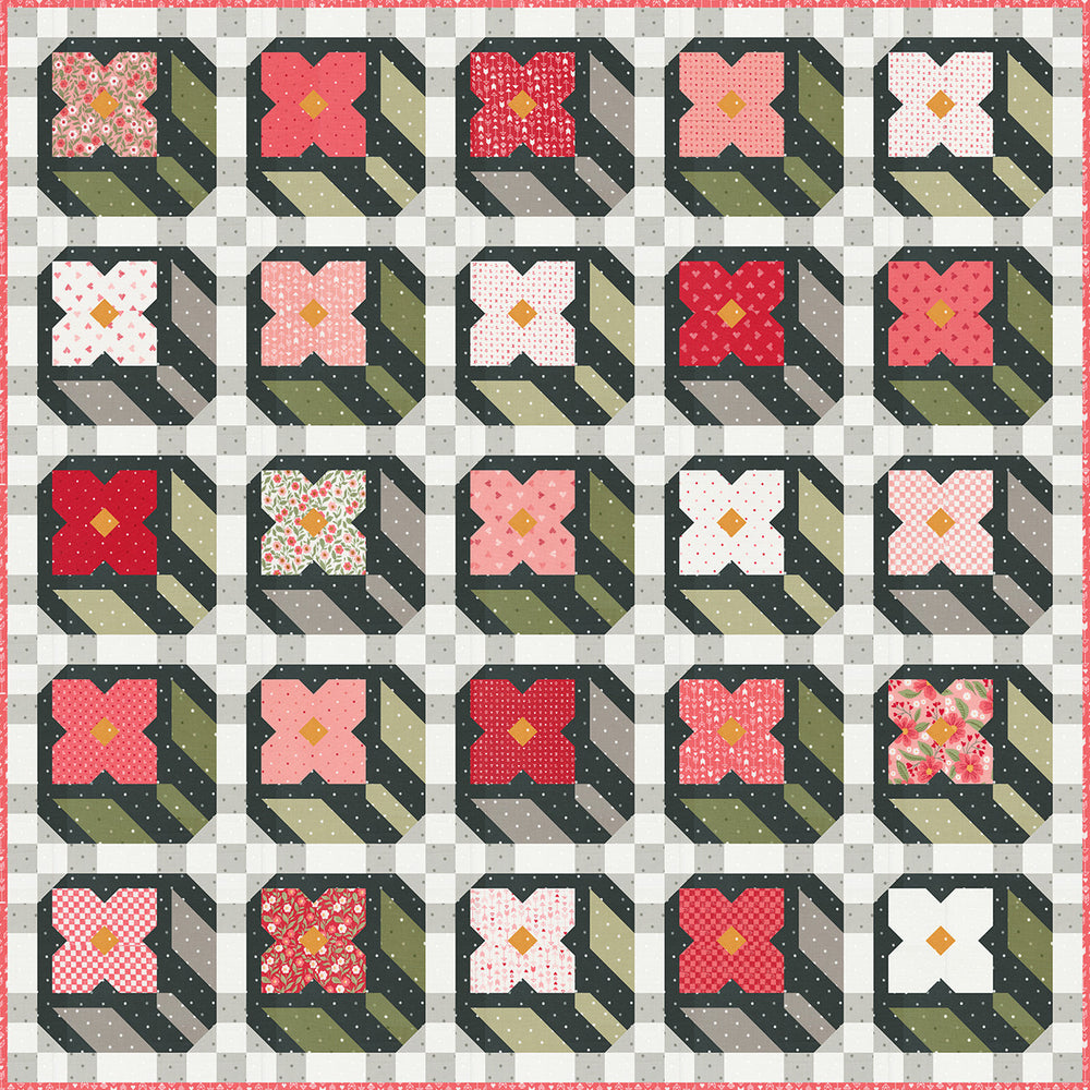 Skill Level: Advanced Beginner MATERIALS NEEDED: (1) Layer Cake (25 squares 10" x 10") -OR- (13) fat eighths 1/4 yard flower center print (SKU #5230 44) (3) 1/2-yard cuts leaf prints (SKUs #5230 16, #5230 18, and #5230 19) 2-3/4 yards charcoal print (SKU #5230 36) 1-1/4 yards grey sashing print (SKU #5230 17) 1-1/4 yards white sashing print (SKU #5230 39) 3/4 yard binding print 4-1/2 yards backing print 81” x 81” batting Fabric is Love Blooms and Magic Dot by Lella Boutique for Moda Fabrics (November 2024).