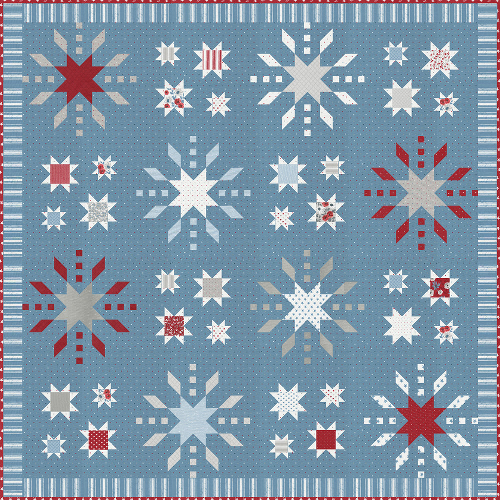 MATERIALS NEEDED: (8) fat quarters 1 charm pack (20 squares 5” x 5”)* 5/8 yard sawtooth star point print 5-1/2 yards background fabric 7/8 yard border fabric 3/4 yard binding fabric 6-1/4 yards backing fabric 87” x 87” batting *Save leftover charms as scraps - or incorporate into a scrappy backing! Fabric is Old Glory by Lella Boutique for Moda Fabrics (Feb 2024).