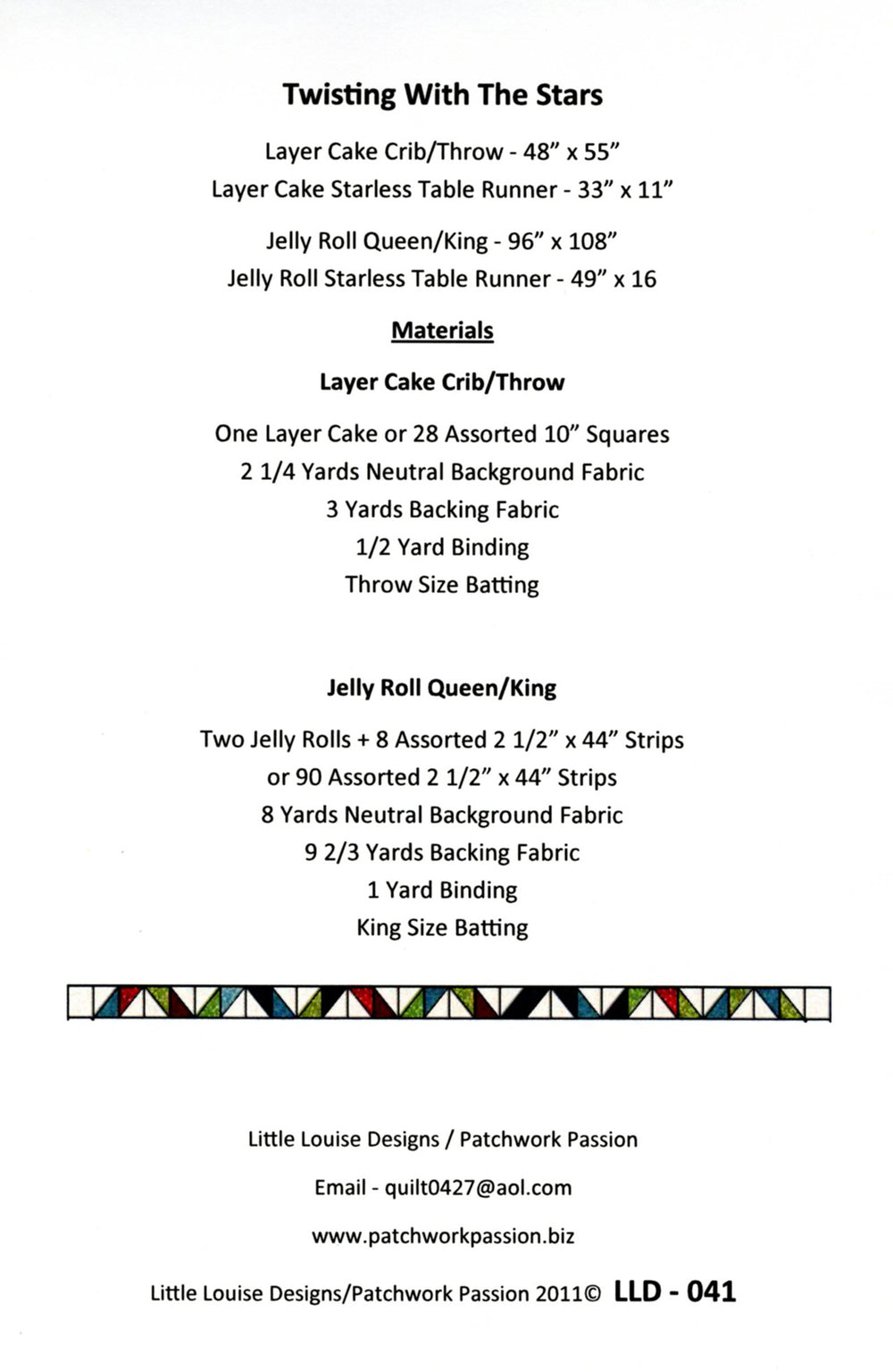 The Twisting with the Stars pattern has directions for a Crib/Throw quilt and a Queen/King quilt plus table runners in two sizes. The pattern is Jelly Roll or Layer Cake friendly for the confident beginner. There are also bonus instructions for an "optional easy quilt."