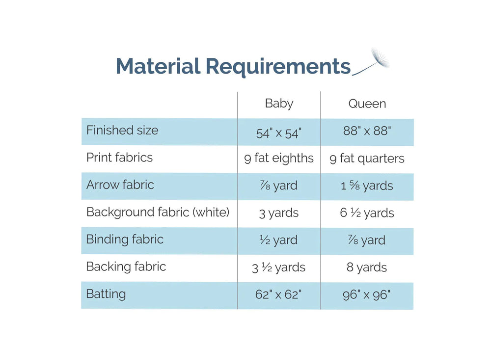 The pattern includes instructions for two sizes: baby and queen. Both sizes have the same design and layout (same number of blocks), with the queen sized blocks and sashing scaled up. See the pictures for the fabric requirements for each size.