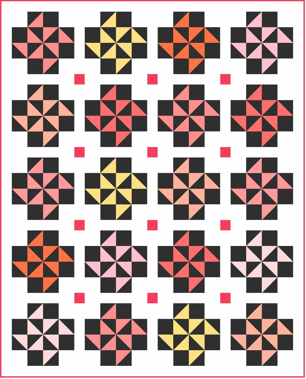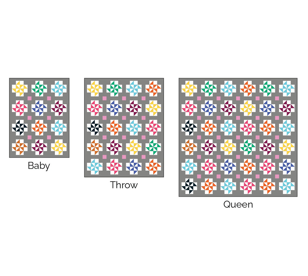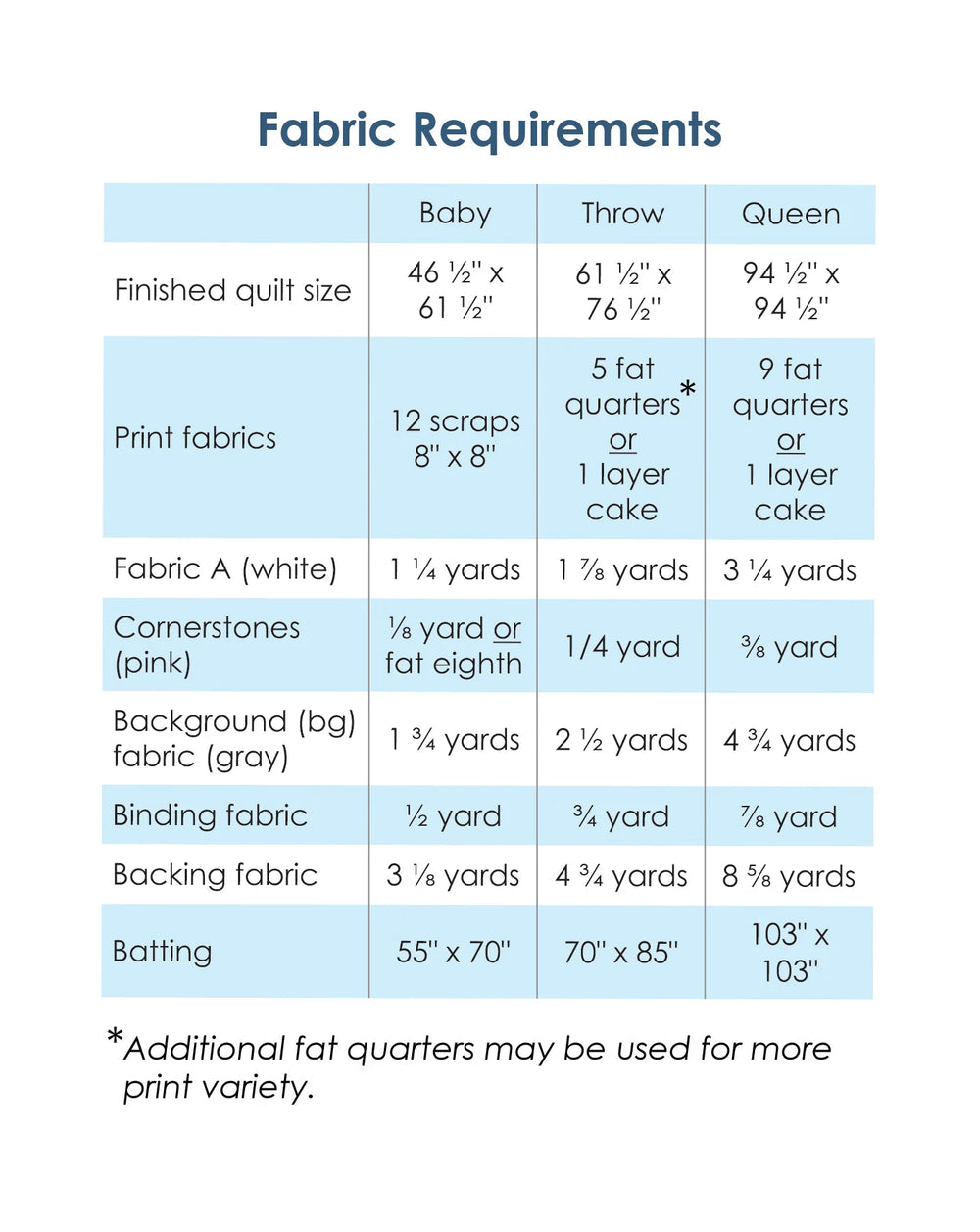 The pattern scrap friendly (baby) and fat quarter and layer cake friendly (throw and queen) and is written at a confident beginner levels, or scraps.