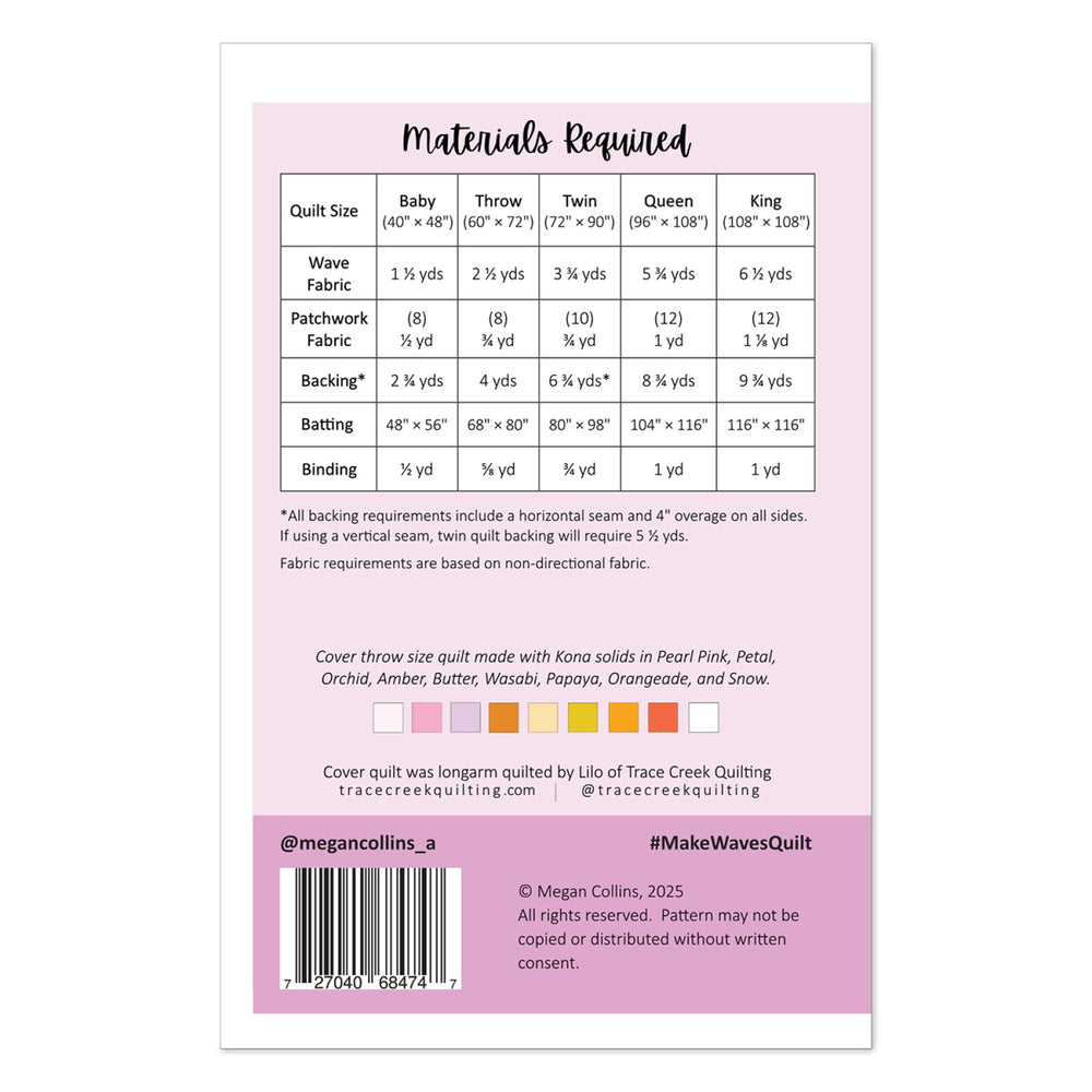 Make Waves is a fresh, modern quilt pattern that blends curves with classic patchwork squares. Designed for confident beginners and beyond, this quilt plays with color and movement—and is easy to make uniquely yours. Quilt sizes: Baby, Throw, Twin, Queen, and King Skill level: Throw–King: Confident beginner-friendly curved piecing Baby: Intermediate (smaller blocks are used to create the same look) Two layout options: Cover Layout : Lots of color and patchwork play with a unifying wave fabric Alternate Layout : 3-color layout that makes the waves pop