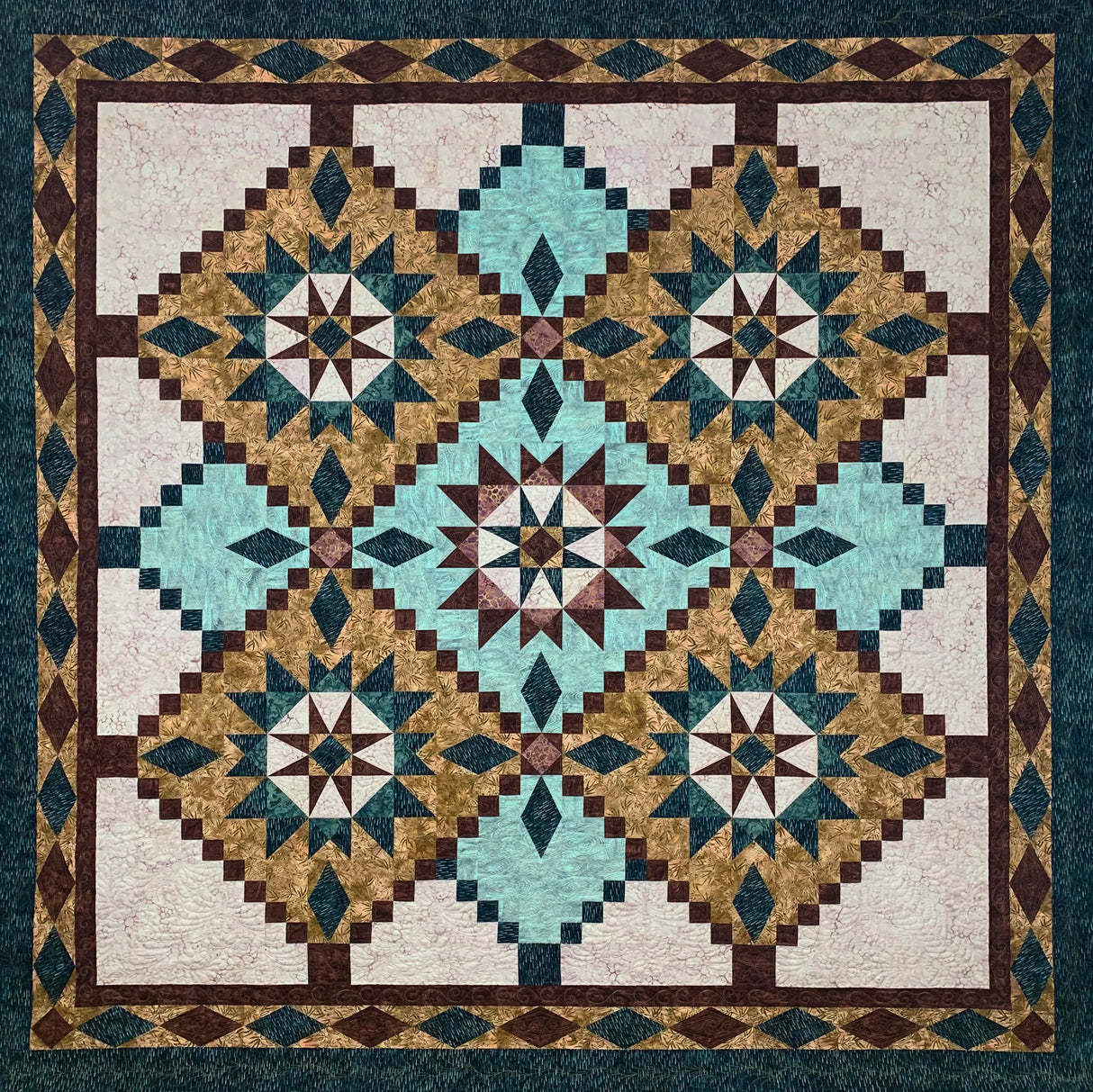 Inspired by the breathtaking landscapes of the Arizona Highlands, this quilt captures the rich reds and golds of the rock formations along with the lush greens of the trees and shrubs.
