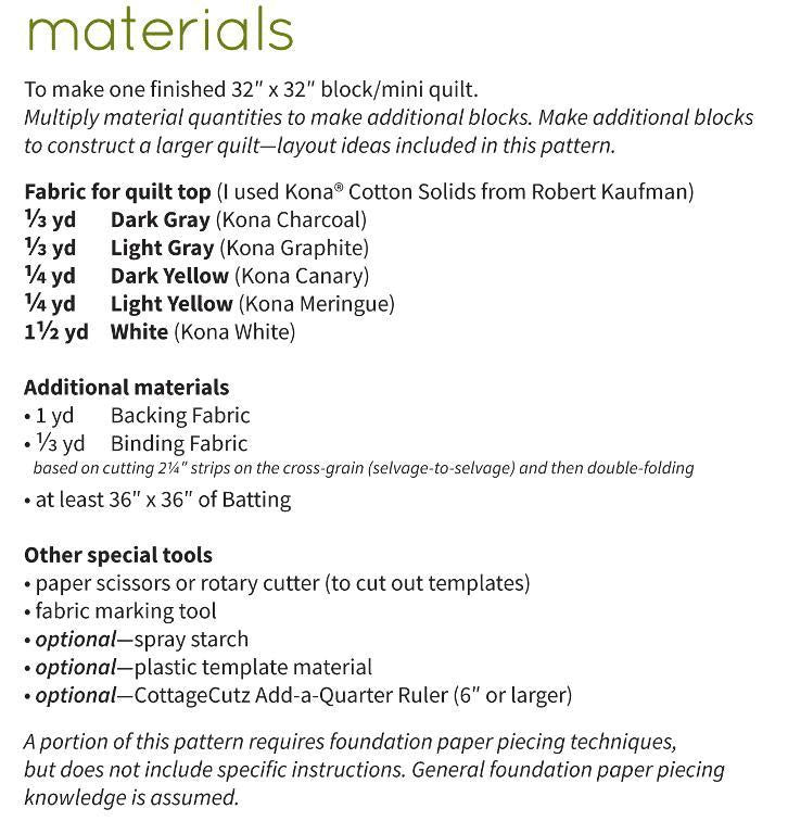 Bzzzzzz is an award-winning modern, graphic wallhanging / mini quilt featuring a combination of traditional machine piecing and foundation paper piecing. Make additional blocks to make a larger quilt (layout ideas are provided to make a lap, twin or queen quilt). This tested pattern contains both detailed instructions and diagrams, making it easy to piece.