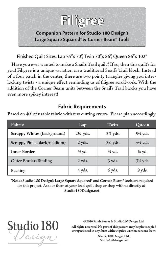 Have you ever wanted to make a Snail’s Trail quilt? If so, then this quilt’s for you! Filigree is a unique variation on a traditional Snail’s Trail block.