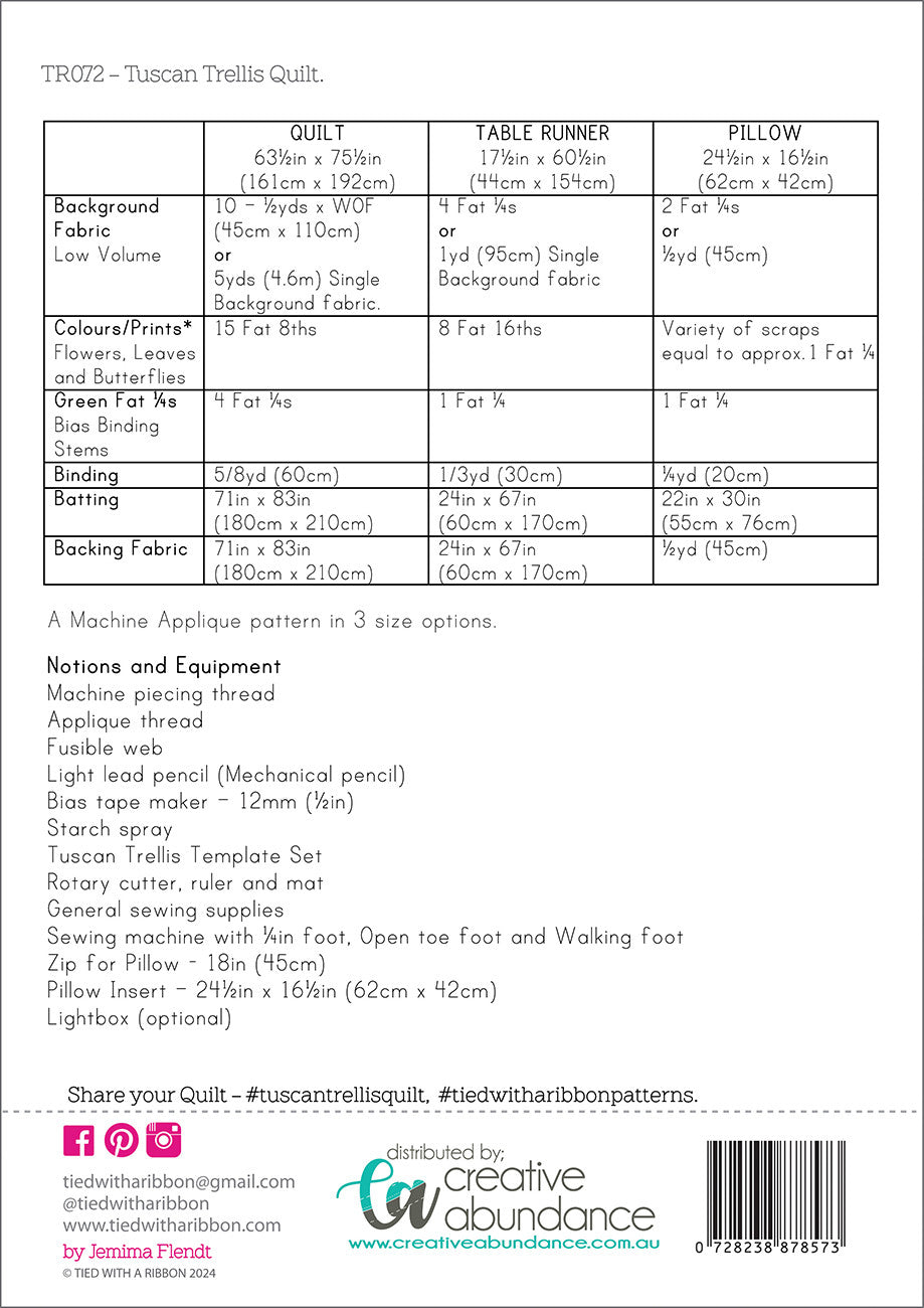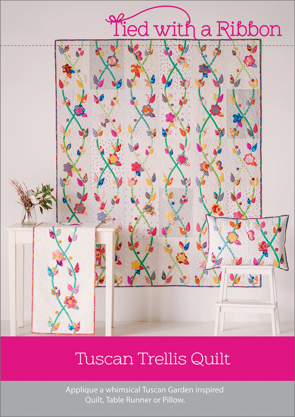 Create a whimsical garden with the Tuscan Trellis Quilt. Inspired by the charm of a Tuscan garden, applique this design to create a visually striking quilt. The pattern is written for Machine Applique but does give guidelines on fabric quantities and use of templates for any Hand Applique technique. Pattern also includes instructions for a table runner and pillow