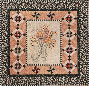 This witchs boot is filled with candies, jack-o-lanterns, and fun funky flowers. The nine patch border are EASY to sew. The crayon tinted design is richly embroidered for stunning impact in your Halloween decorationg. 40in x 32-1/2in.