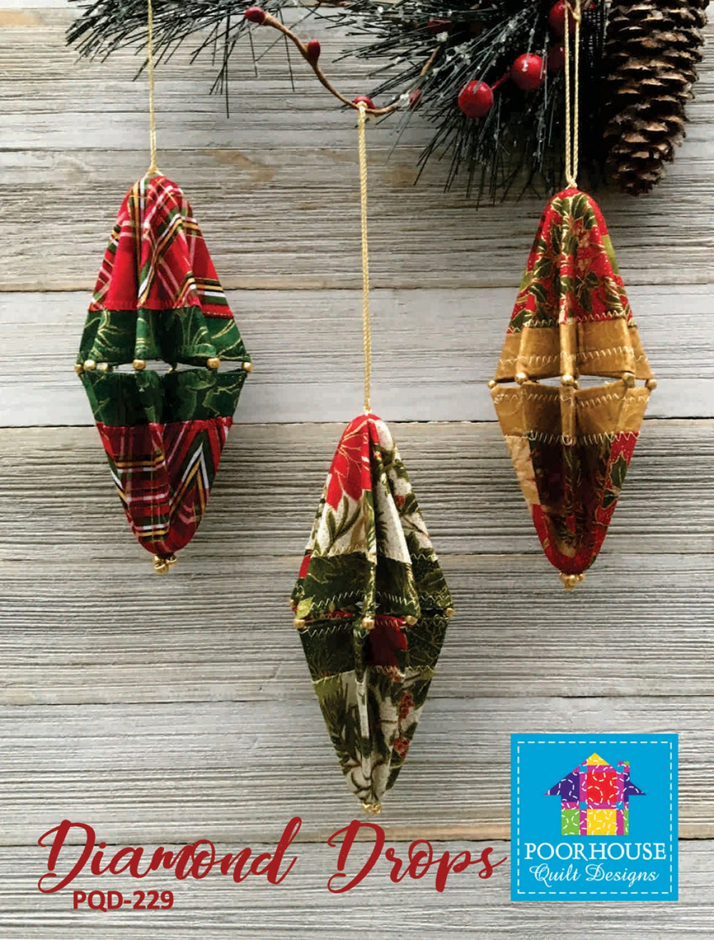 Diamond Drops - a mid-century shape with a vintage feel! Ornaments measure 5in tall. Use traditional or modern fabrics - add beads and Voila! - you have a great ornament - perfect for giving!