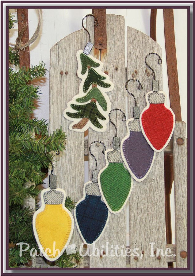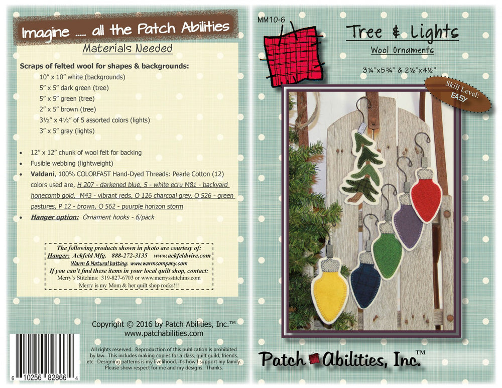 Tree ornament measures 3 1/4" x 5 3/4" and each Light measures 2 1/2" x 4 1/2". Pattern includes complete embroidery hand stitching directions. Wool kit includes wool to make all 5 lights and tree.