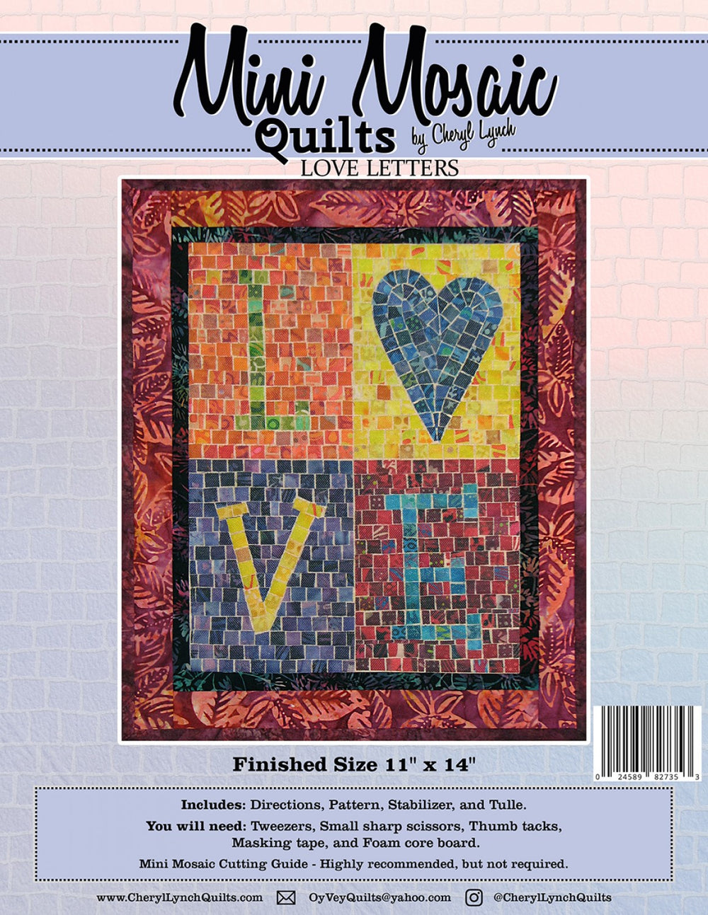 The Love Letters mosaic quilt pattern offers a low sew technique developed by Cheryl Lynch. It contains instructions to create a quilt from 3/8" batik squares. Included in the package is the pattern, directions, sticky stabilizer, netting and suggested fabric colors. Finished size: 11in x 14in