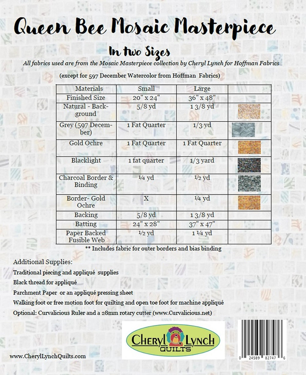 Queen Bee Mosaic Masterpiece is a fusible applique pattern with directions for 2 sizes of wallhangings. It includes full size patterns and step by step color instructions. The wall hangings finish at 20"x24" and 36"x48". The larger wall hanging has an optional scalloped border. 9" X 12"
