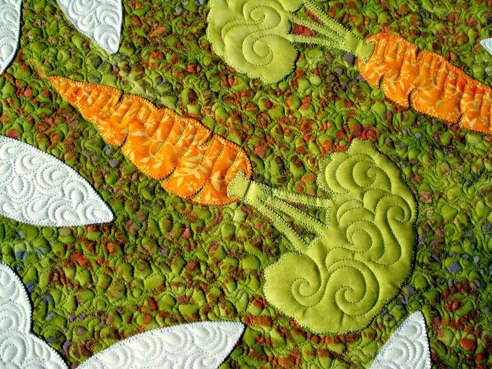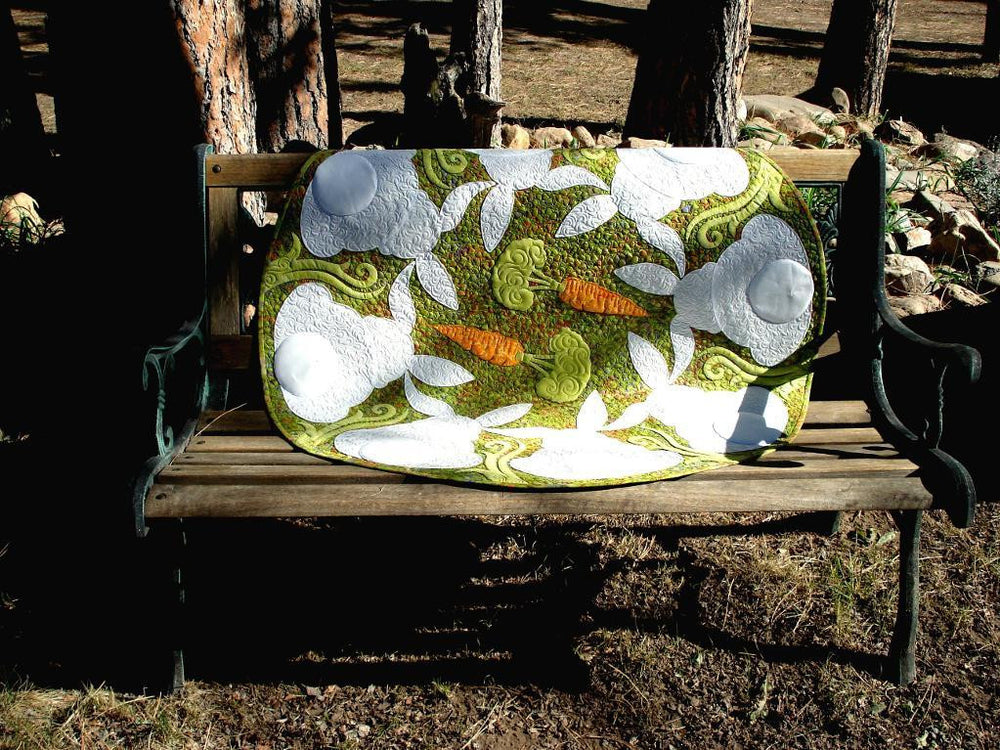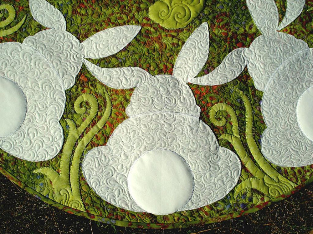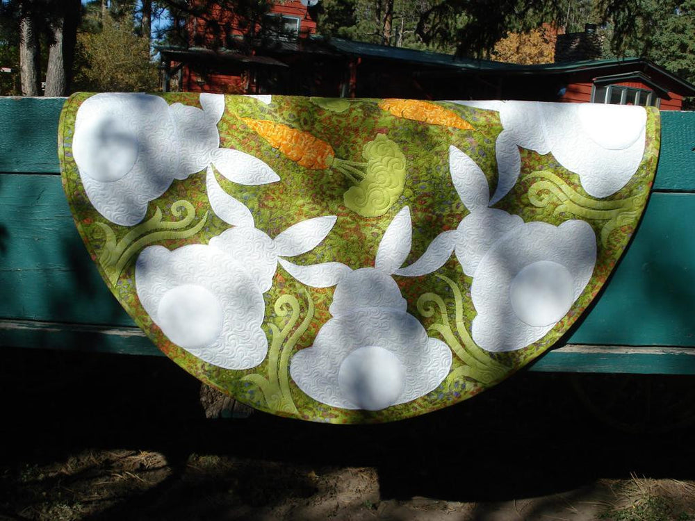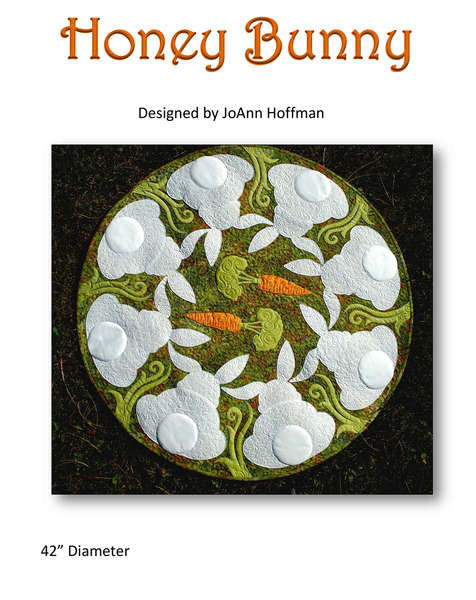 42in inch round quilt pattern. Cute little bunnies gathered around carrots. Raw edge applique.
