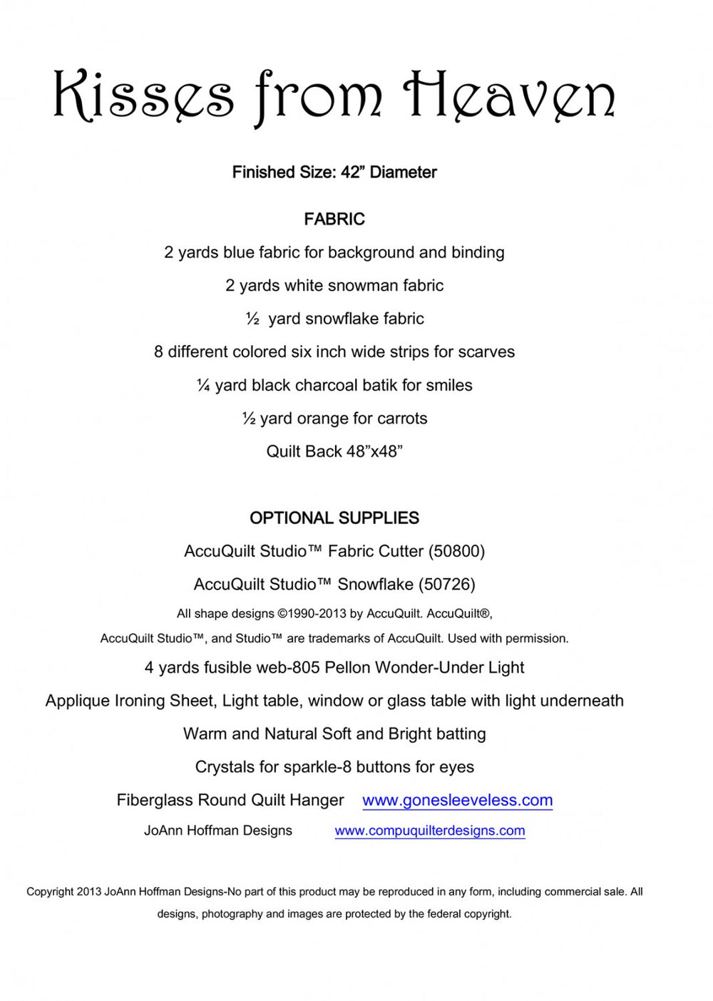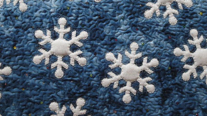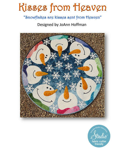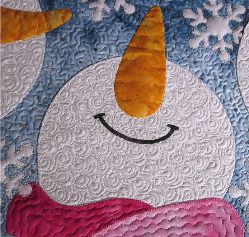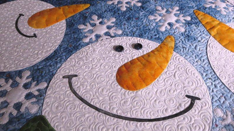 42in round quilt pattern. Cute snowmen waiting for snowflakes to kiss their cheeks. Raw edge applique.