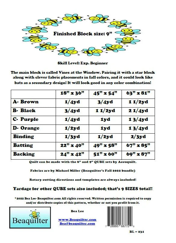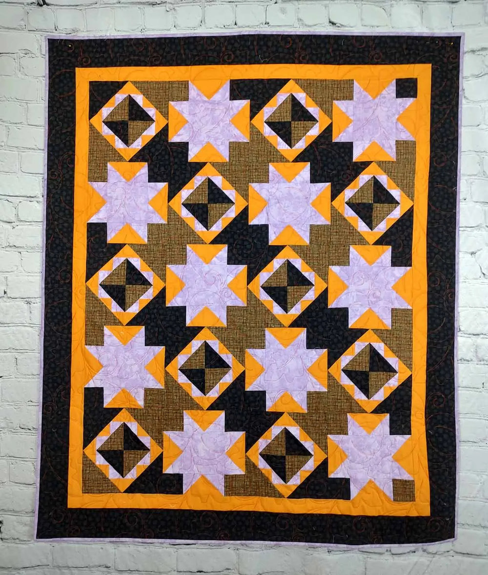 The main block is called Vines at the Window. Pairing it with a star block along with clever fabric placements in fall colors, and it could look like bats as a secondary design! It will look good in any color combination!