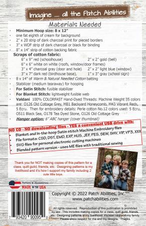 Our patterns with a "-ME" suffix include a convenient USB stick with Machine Embroidery files: CSD, DST, EMD, EXP, HUS, JEF, PES, SEW, SHV, VIP, VP3, and XXX. Who says, "School is for the birds"? Quaint brick schoolhouse is actually a birdhouse waiting for a sparrow, bluebird, or some other cutie.