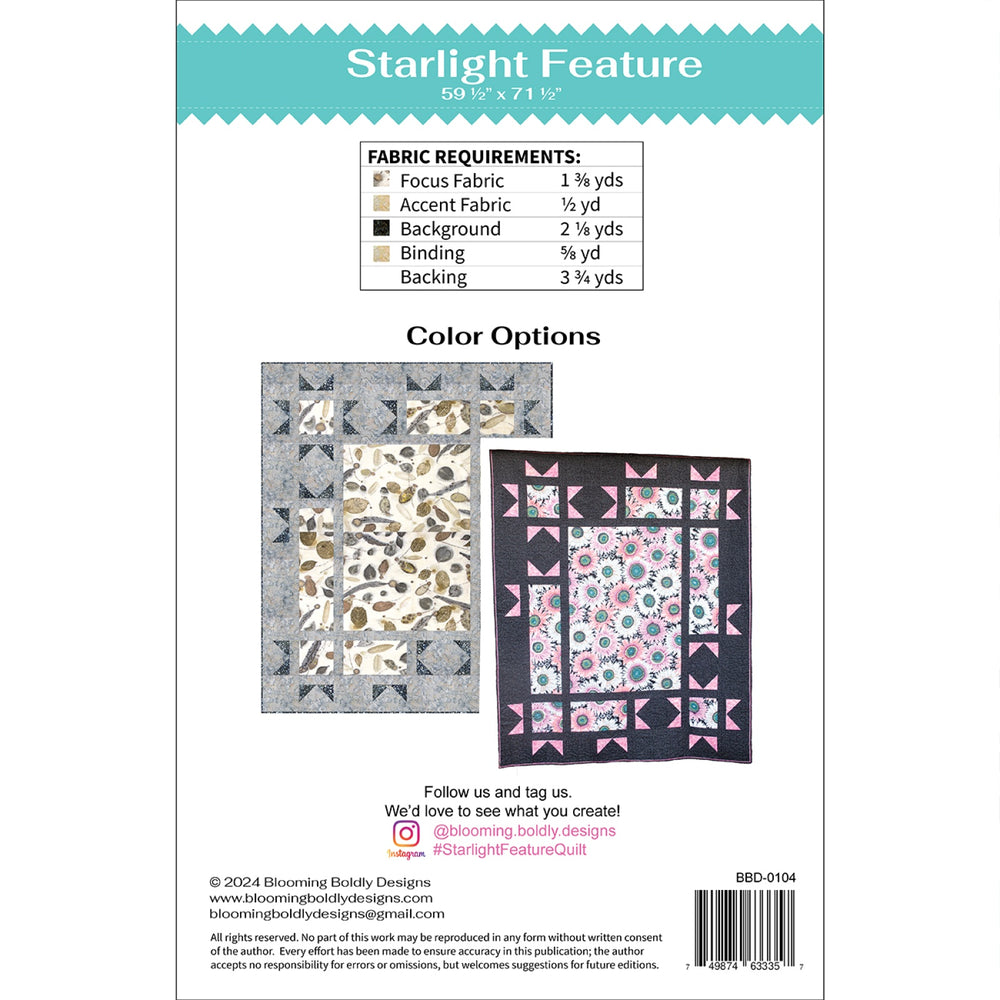 Starlight Feature Quilt by Leslie Ryan of Blooming Boldly Designs is perfect for any feature fabric that is too pretty to cut up. This pattern let's the the fabric shine by adding a border of star points. Traditional piecing methods. Finished size is 59 1/2 x 71 1/2.