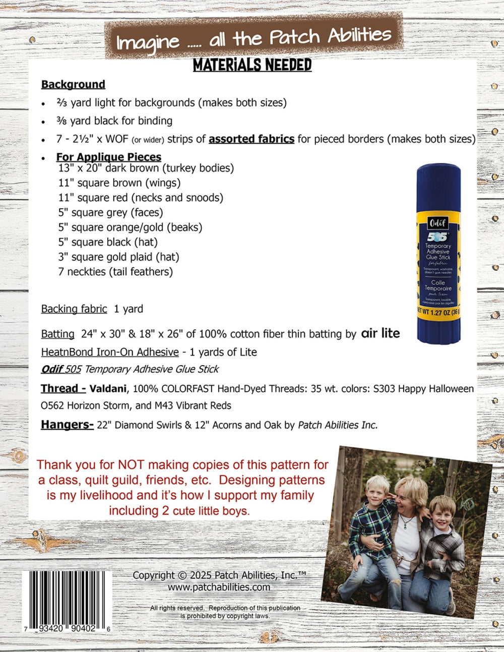 Make 2 sizes of turkeys with 7 neckties. Choose your size of colorful turkey will give new life to old ties in a keepsake Thanksgiving decor that will be cherished for generations. Pattern includes complete step-by-step directions on how to prepare ties. Turkey is created with traditional raw edge applique with fusible web. So, dig out those vintage neckties or shop thrift stores, you'll look at neckties differently now, especially wild ones.