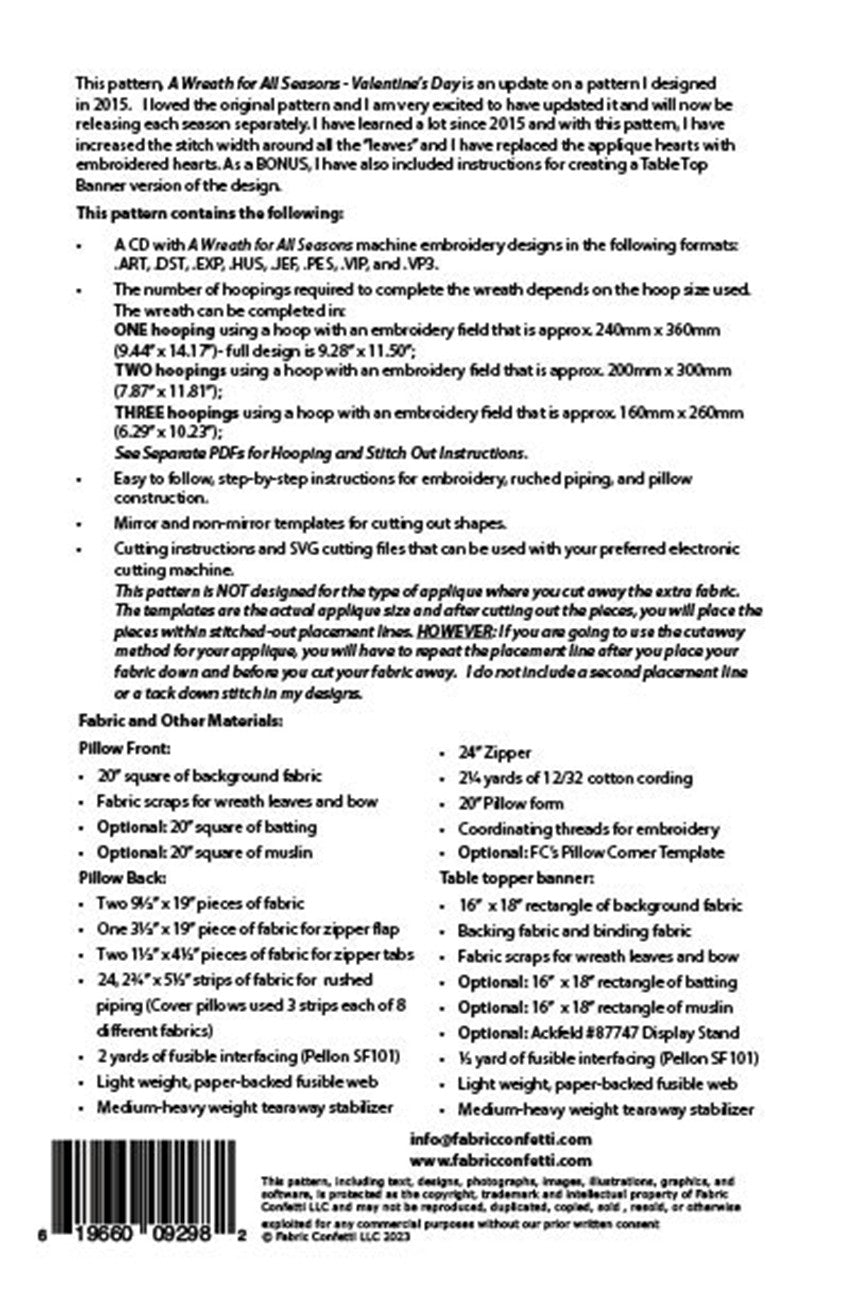 This pattern, A Wreath for All Seasons - Valentine’s Day is an update on a pattern I designed in 2015. I loved the original pattern and I am very excited to have updated it and will now be releasing each season separately. I have learned a lot since 2015 and with this pattern, I have increased the stitch width around all the “leaves” and I have replaced the applique hearts with embroidered hearts.