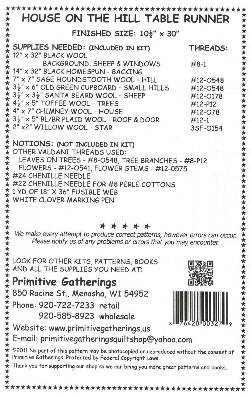 What is nice about this runner is the space in the middle so you can put your favorite candle, prim fixin's or flowers and still see the design. Runner is 10 1'2" x 30".